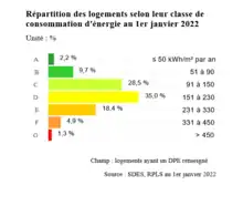 Dans le cadre de la lutte contre l'« habitat indigne » et la précarité énergétique, la mise en location des logements classés G, F et E, dits « passoires thermiques »[2], sera interdite respectivement à partir de 2025 (classe G), 2028 (classe F) et 2034 (classe E). Depuis 2022, les logements de classes F et G font aussi l'objet d'un gel des loyers[3] pour les locataires déjà titulaires d'un bail comme lors d'une relocation et les annonces de vente ou de location portant sur ces logements doivent obligatoirement porter la mention « Logement à consommation énergétique excessive »[4].