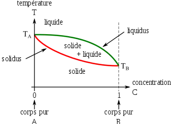 - le liquidus : au-dessus de cette courbe, le produit est entièrement liquide ; le liquidus définit la composition du liquide qui est à l'équilibre avec un solide à une température donnée ;