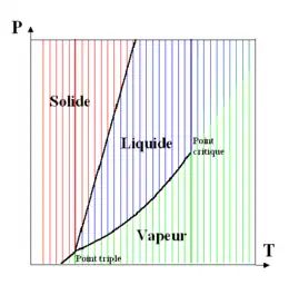 - entre une phase liquide et une phase vapeur : vaporisation - liquéfaction ; la courbe de changement d'état liquide-vapeur s'interrompt en un point appelé point critique, au-delà duquel[note 3] le corps ne présente plus qu'une seule phase fluide, plutôt proche (du point de vue de ses propriétés physiques) d'un gaz[note 4] aux pressions inférieures à la pression critique, plutôt proche d'un liquide aux pressions supérieures à la pression critique.