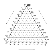 On impose généralement aux données (a, b, c) d'un même triplet d'avoir une somme constante s, le plus souvent égale à 1 ou à 100 (sous-entendu, 100 %). Si les données d'origine (α, β, γ) ne vérifient pas d'emblée cette contrainte[alpha 1], on les remplace par :