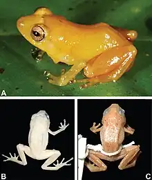 Diasporus citrinobapheus[2] mesure entre 17,3 et 19,7 mm[3] pour les mâles et 21,8 mm pour la seule femelle connue[4]. Son dos est jaune brillant ou orangé nuancé de sombre. Sa face ventrale est translucide hormis le sac vocal du mâle qui est jaune.