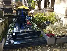 Il est inhumé le au cimetière de Montmartre (division 11)[93], après une cérémonie à l'église Saint-Pierre de Montmartre en présence de plus de quatre cents admirateurs et de très nombreuses personnalités[94]. Sa sépulture est originale, la pierre tombale — figurant une route avec ses dates de naissance et de mort dans des écussons comme ceux indiquant le nom des routes aux États-Unis, telles la fameuse route 66 — est surplombée d'une stèle gravée de son nom, de son surnom, de sa signature et de son portrait et ajourée d'une vitre bleue en forme de guitare[95].