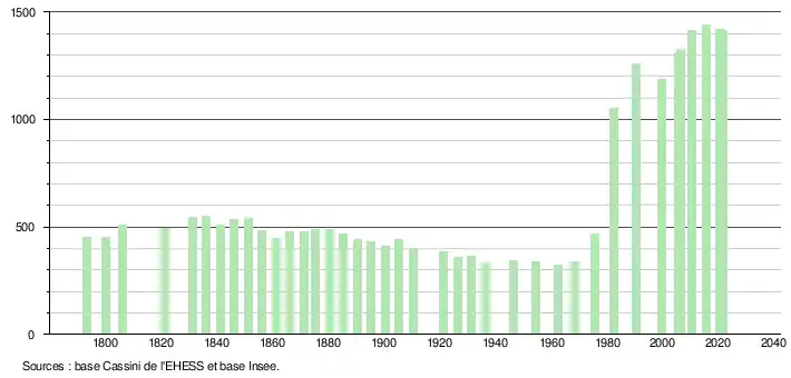 L'évolution du nombre d'habitants est connue à travers les recensements de la population effectués dans la commune depuis 1793. Pour les communes de moins de 10 000 habitants, une enquête de recensement portant sur toute la population est réalisée tous les cinq ans, les populations légales des années intermédiaires étant quant à elles estimées par interpolation ou extrapolation[21]. Pour la commune, le premier recensement exhaustif entrant dans le cadre du nouveau dispositif a été réalisé en 2005[22].