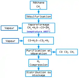 Le vaporeformage d'hydrocarbures est le procédé qui, au début du XXIe siècle, est le plus utilisé au niveau industriel. Son principe repose sur la réaction d'hydrocarbures (méthane…) en présence de vapeur d'eau et de chaleur. La réaction globale s'écrit :