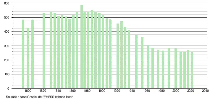 L'évolution du nombre d'habitants est connue à travers les recensements de la population effectués dans la commune depuis 1793. Pour les communes de moins de 10 000 habitants, une enquête de recensement portant sur toute la population est réalisée tous les cinq ans, les populations légales des années intermédiaires étant quant à elles estimées par interpolation ou extrapolation[23]. Pour la commune, le premier recensement exhaustif entrant dans le cadre du nouveau dispositif a été réalisé en 2006[24].