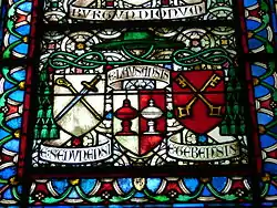 Blason | Tiercé en pairle renversé : au premier parti d'argent et de gueules à deux ciboires de l'un en l'autre, au deuxième de gueules à deux clefs d'or croisées en sautoir, au troisième d'azur au bras bénissant, habillé et issant d'un nuage mouvant de la pointe, le tout d'argent