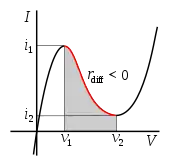 - le dopage des couches P et N est si important que la tension de claquage est égale à zéro volt (contre une tension qui peut atteindre plusieurs centaines de volts pour une diode classique). Cette diode conduit donc en inverse (polarisée négativement), mais lors de son utilisation en direct (sens positif), l'effet tunnel se produit donnant à la caractéristique de cette diode une zone où l’augmentation de la tension aux bornes de la diode entraîne une diminution du courant la traversant. Cela correspondant à une résistance négative. Cette résistance dynamique négative peut être employée pour réaliser une version semi-conducteur de l'oscillateur dynatron qui utilise normalement une tétrode, un type de tube électronique.