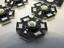 Les LED de puissance ont des formes plus homogènes : la Luxeon W ci-contre est assez représentative. Ces types de LED sont également disponibles en version « multicœur », « multipuces », ou « multichips » en anglais, dont la partie émissive est composée de plusieurs puces semi-conductrices.