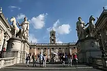 Le culte de Castor et Pollux apparaît également à Tusculum et Rome. En , les Romains leur bâtissent un temple sur le Forum romain en remerciement pour la victoire du lac Régille[35]. Selon la légende, les Dioscures sont intervenus dans le combat en personne, sous l'apparence de grands et beaux cavaliers, puis ont annoncé eux-mêmes sur le Forum la victoire romaine[36]. Un deuxième temple leur est dédié à Rome, entre 74 et , construit sur le Champ de Mars, à proximité du Cirque Flaminius[37].