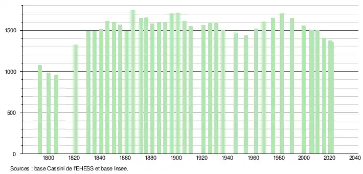 L'évolution du nombre d'habitants est connue à travers les recensements de la population effectués dans la commune depuis 1793. Pour les communes de moins de 10 000 habitants, une enquête de recensement portant sur toute la population est réalisée tous les cinq ans, les populations légales des années intermédiaires étant quant à elles estimées par interpolation ou extrapolation[19]. Pour la commune, le premier recensement exhaustif entrant dans le cadre du nouveau dispositif a été réalisé en 2005[20].