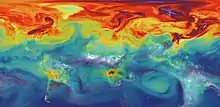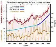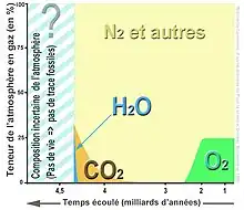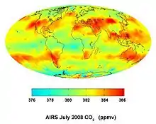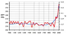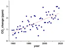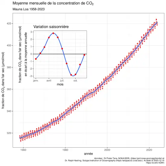 En décembre 2023, l'atmosphère terrestre comportait 421 ppmv (parties par million en volume) de CO2, soit 0,0421 %. Cette teneur était de 283 ppmv en 1839 d'après des carottes de glace prélevées dans l'Antarctique, soit une augmentation globale d'environ 49 % en 184 ans.