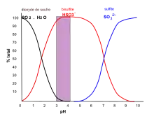 En solution aqueuse, il s'établit donc un équilibre entre le dioxyde de soufre en solution (le SO2 moléculaire), l'anion bisulfite (HSO3) et l'ion sulfite (SO32−). En œnologie par convention, ces trois formes sont dites « dioxyde de soufre libre » ou « anhydride sulfureux libre ». L'équilibre entre ces formes dépend du pH. Ainsi pour un pH de 3-4, correspondant au vin, le bisulfite est l'espèce dominante[5]. Il résulte de ces notions que les propriétés antiseptiques, vis-à-vis des bactéries et des levures, d'une dose donnée "d'anhydride sulfureux libre" dépendent du pH. De même, comme on peut voir sur les courbes, l'odeur désagréable du SO2 gazeux (le SO2H2O moléculaire) est d'autant plus importante que le vin est plus acide (pour une même valeur d'anhydride sulfureux libre).