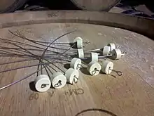 Mèches de soufre prêtes à être brûlées dans des fûts.