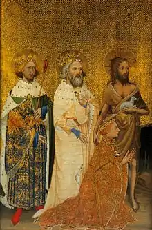 Les trois saints auréolés, portant pour deux d'entre eux une couronne royale et de riches vêtements, et pour le dernier une humble peau de mouton nouée à la taille par une simple corde, présentent chacun de la main droite Richard agenouillé à la Vierge et l’Enfant. Les attributs qu'ils tiennent dans la main gauche les rendent identifiables : Edmond le Martyr, à gauche, porte la flèche danoise qui l’a tué en 869, Édouard le Confesseur, au centre, serre entre le pouce et l'index l’anneau qu’il donna à un pèlerin (qui se révéla être l'Apôtre Jean), et Jean le Baptiste, à droite, tient contre son sein l’Agneau de Dieu, son symbole. Tous revêtent une signification particulière pour le Roi : Édouard le Confesseur par exemple possède à l’abbaye de Westminster une chapelle qui lui est dédiée, et c'est sur son tombeau que Richard vint se recueillir en temps de crise — les armes supposées d'Édouard étant par ailleurs écartelées de celles des Rois d'Angleterre sur le blason figuré sur le panneau extérieur gauche. Saint Jean-Baptiste, qui touche l'épaule du Roi dont il était le Saint patron, évoque la naissance de Richard, le 6 janvier : une tradition chrétienne ancienne confondait en effet l'Épiphanie et le Baptême du Christ. Mais la présence de trois saints peut aussi évoquer les Rois mages de l'Épiphanie, ou renvoyer à la légende selon laquelle Richard, à sa naissance à Bordeaux, fut visité par les rois d’Espagne, de Navarre et du Portugal.