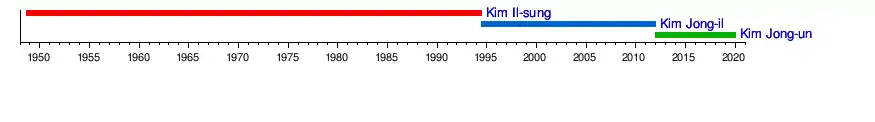 Les chefs suprêmes de la RPDC sont successivement Kim Il-sung, son fils Kim Jong-il et son petit-fils Kim Jong-un. Dans ce rôle, ils n’ont pas de titres réguliers, mais tous dirigent le Parti des travailleurs de Corée - avec le titre de président de 1948 à 1966, de secrétaire général de 1966 à 2011, de premier secrétaire de 2011 à 2016, de président à nouveau de 2016 à 2021 et de nouveau secrétaire général depuis 2021- pendant presque toute leur période de pouvoir. Même s'ils ont l'apparence d'une dynastie, il n'y a pas de succession formelle.