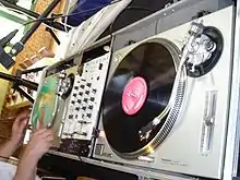 - Mixage : les disques sont synchronisés manuellement à l'aide des réglages de vitesse des platines et sont mélangés avec diverses variations, portant notamment sur les égalisations (niveau des fréquences graves, médium et aiguës), ainsi que sur l'utilisation des faders et crossfaders.
