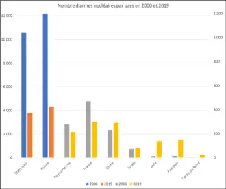 La fin de la guerre froide favorise les initiatives de désarmement. Gorbatchev et Reagan sont tout près à Helsinki en 1986 de s'entendre sur un véritable traité de désarmement nucléaire. À défaut, ils signent en 1987 le traité sur les forces nucléaires à portée intermédiaire qui élimine totalement les missiles d'une portée comprise entre 500 et 5 500 km[4]. Les États-Unis et la Russie continuent de s'entendre sur la réduction de leurs arsenaux nucléaires stratégiques ; le plus récent accord en la matière est le traité New Start signé en 2010 par Obama et Medvedev par lequel les plafonds d'ogives et de vecteurs nucléaires sont réduits. Ces deux puissances possèdent toujours des armes nucléaires tactiques[5]. Malgré une réduction des deux-tiers du nombre de leurs armes nucléaires depuis la fin de la guerre froide, les États-Unis et la Russie possèdent dans les années 2010 près de 90 % des armes nucléaires dans le monde.