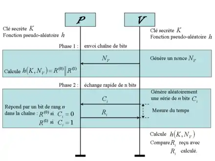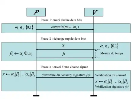 Une série de bits de défis et de réponses est échangée rapidement. Le vérificateur génère aléatoirement une série de bits . Le prouveur répond aussi vite que possible bit à bit par une série de bits . est calculé par le prouveur en effectuant un ou exclusif entre le bit reçu et le bit [64]. Le temps d'aller-retour (RTT) des bits échangés est mesuré par le vérificateur [2].