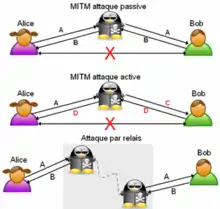 L'attaque Man-In-The-Middle est une attaque où le pirate intercepte les communications entre 2 parties sans que ceux-ci s’en rendent compte[37]. Il peut ainsi espionner les messages, on parle alors d’attaque passive, voire les altérer, les modifier ou les remplacer, on parle alors d’attaque active[38],[39]. Plusieurs attaques, comme la mafia fraud ou la terrorist fraud, sont une forme d’attaque Man-In-The-Middle[40].