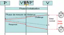 Les distance-bounding protocols[note 1] qui pourraient être traduits par protocoles délimiteurs de distance, sont des protocoles de sécurité qui permettent à un vérificateur de s'assurer qu'un prouveur se trouve à une distance bornée et définie de lui-même. Leur but est d'améliorer les mécanismes d'authentification traditionnels, de fournir une garantie supplémentaire tel un indicateur de distance pour le routage sécurisé des réseaux ad-hoc. Ces protocoles permettent entre autres de se prémunir des attaques du type Man-In-The-Middle[note 2] et de ses dérivés, en calculant la distance entre et [1]. Cette distance est obtenue en multipliant la vitesse d'une onde électromagnétique par le temps que met à envoyer un message à [2].