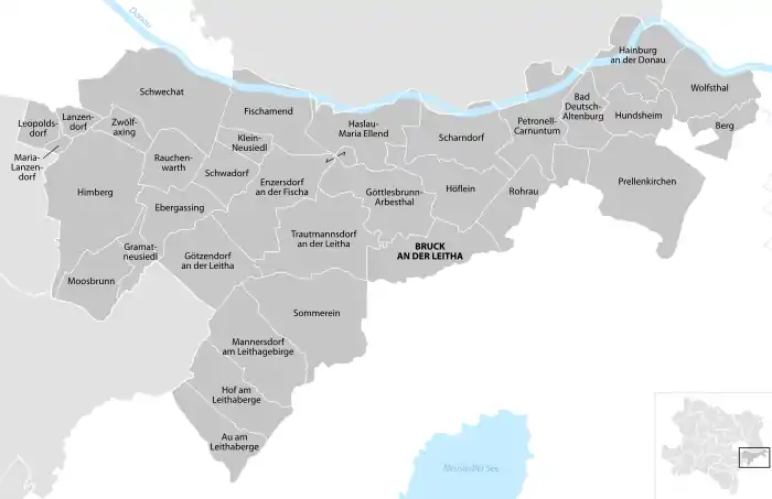 Le district de Bruck an der Leitha est subdivisé en 33 communes :