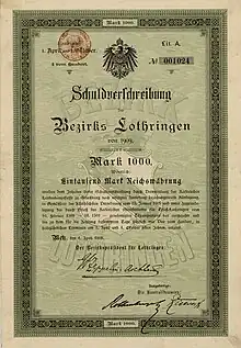 Obligation du district de Lorraine en date du 1 avril 1909 avec la signature d'administrateur civil