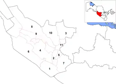 Ces districts sont listés ci-dessous par province, en suivant approximativement une direction d'ouest en est (soit en suivant les repères du plan ci-contre : 14, 13, 7 , 3, 8, 9, 5, 11, 10, 12,6, 4, 2).