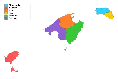 | 4 | Manacor | Ariany, Artà, Campos, Capdepera, Felanitx, Manacor, Montuïri, Petra, Porreres, Ses Salines, Sant Joan, Sant Llorenç des Cardassar, Santanyí, Son Servera et Vilafranca de Bonany[5]. |