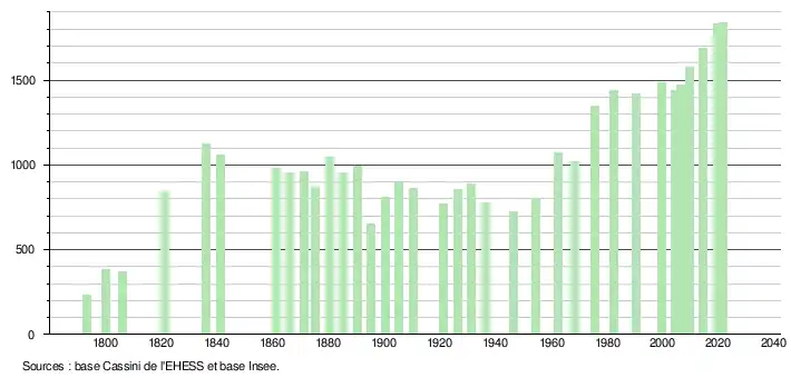L'évolution du nombre d'habitants est connue à travers les recensements de la population effectués dans la commune depuis 1793. Pour les communes de moins de 10 000 habitants, une enquête de recensement portant sur toute la population est réalisée tous les cinq ans, les populations légales des années intermédiaires étant quant à elles estimées par interpolation ou extrapolation[27]. Pour la commune, le premier recensement exhaustif entrant dans le cadre du nouveau dispositif a été réalisé en 2004[28].