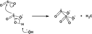 En solution aqueuse, l'ion disulfite se forme en petites quantités par déshydratation de bisulfite par l'équilibre :