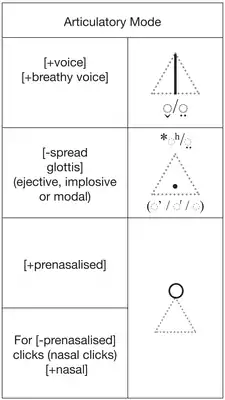 - Pour les consonnes non-voisées, un point plein dans le triangle indique une consonne glotallisée (éjectée) ou une consonne de clic modal.