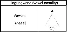 La nasalité des voyelles est indiquée par le graphème ingungwana, qui est un point solide à l'extérieur du triangle séparé de l'apex, comme dans le mot phãsi ci-dessous :