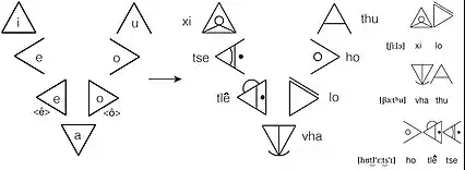 Les symboles, formés d'un triangle ou d’un chevron, représentent le noyau de la syllabe; à l’exception des syllabes nasales (amaqanda) qui sont représentées par des cercles et qui remplissent tout l'ibheqe.