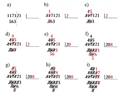 Voici la description de l'algorithme appliqué à la division de 117 121 par 563 :