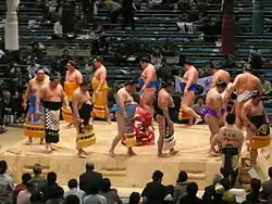 Jūryō (十両), est la seconde division, comprenant 28 lutteurs[1]. Son nom signifie « dix ryō », soit la somme que les lutteurs recevaient généralement à une certaine époque. Le nom officiel est en fait jūmaime (十枚目), ce qui signifie « dixième place », et peut être entendu ou lu dans les communications officielles. Mais l'usage, y compris dans le monde-même du sumo, est d'appeler cette division jūryō. Les lutteurs de jūryō et makuuchi sont appelés sekitori. Les lutteurs de jūryō, comme ceux de makuuchi, reçoivent un salaire mensuel ainsi que des bénéfices complémentaires liés à leur statut de sekitori. Les lutteurs des divisions inférieures sont considérés comme en formation et reçoivent une indemnité réduite au lieu d'un salaire.