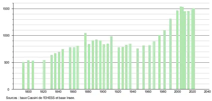 L'évolution du nombre d'habitants est connue à travers les recensements de la population effectués dans la commune depuis 1793. Pour les communes de moins de 10 000 habitants, une enquête de recensement portant sur toute la population est réalisée tous les cinq ans, les populations légales des années intermédiaires étant quant à elles estimées par interpolation ou extrapolation[20]. Pour la commune, le premier recensement exhaustif entrant dans le cadre du nouveau dispositif a été réalisé en 2004[21].