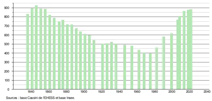 L'évolution du nombre d'habitants est connue à travers les recensements de la population effectués dans la commune depuis 1836. Pour les communes de moins de 10 000 habitants, une enquête de recensement portant sur toute la population est réalisée tous les cinq ans, les populations légales des années intermédiaires étant quant à elles estimées par interpolation ou extrapolation[21]. Pour la commune, le premier recensement exhaustif entrant dans le cadre du nouveau dispositif a été réalisé en 2008[22].