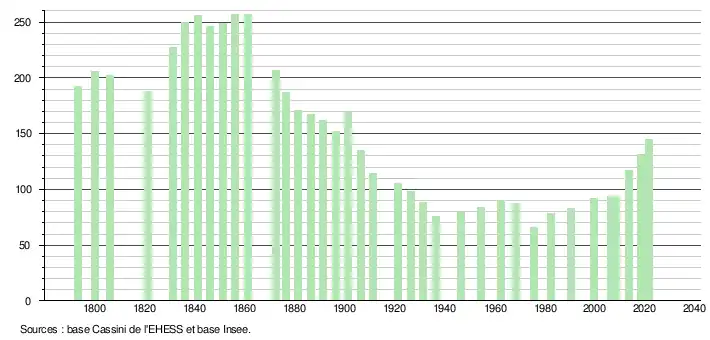 L'évolution du nombre d'habitants est connue à travers les recensements de la population effectués dans la commune depuis 1793. Pour les communes de moins de 10 000 habitants, une enquête de recensement portant sur toute la population est réalisée tous les cinq ans, les populations légales des années intermédiaires étant quant à elles estimées par interpolation ou extrapolation[22]. Pour la commune, le premier recensement exhaustif entrant dans le cadre du nouveau dispositif a été réalisé en 2008[23].