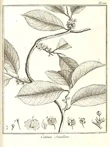 Cet arbrisseau pouſſe des tiges ligneuſes ; ſarmenteuſes & rameuſes, qui ſe répandent ſur les arbres voiſins. Les rameaux ſont garnis de feuilles alternes, liſſes, vertes, entières, ovales, terminées en pointe ; les plus grandes ont quatre pouces de longueur, ſur deux de largeur ; leur pédicule eſt court, convexe en deſſous, creuſé en gouttiere en deſſus. Les fleurs naiſſent à l'aiſſelle des feuilles &t ſur les rameaux ; elles, ſont rangées alternativement par petits bouquets, ſur une petite éminence. Leur pédoncule, à ſa baſe, eſt garni de deux petites écailles. Le calice eſt ſoutenu par deux petites écailles, & eſt diviſé en trois parties concaves, arrondies, vertes.