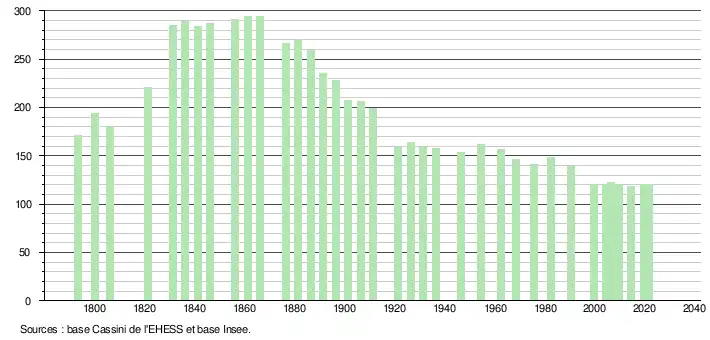 L'évolution du nombre d'habitants est connue à travers les recensements de la population effectués dans la commune depuis 1793. Pour les communes de moins de 10 000 habitants, une enquête de recensement portant sur toute la population est réalisée tous les cinq ans, les populations légales des années intermédiaires étant quant à elles estimées par interpolation ou extrapolation[17]. Pour la commune, le premier recensement exhaustif entrant dans le cadre du nouveau dispositif a été réalisé en 2004[18].