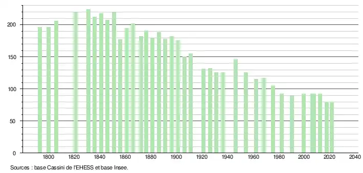 L'évolution du nombre d'habitants est connue à travers les recensements de la population effectués dans la commune depuis 1793. Pour les communes de moins de 10 000 habitants, une enquête de recensement portant sur toute la population est réalisée tous les cinq ans, les populations légales des années intermédiaires étant quant à elles estimées par interpolation ou extrapolation[18]. Pour la commune, le premier recensement exhaustif entrant dans le cadre du nouveau dispositif a été réalisé en 2007[19].