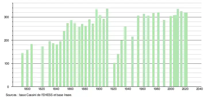 L'évolution du nombre d'habitants est connue à travers les recensements de la population effectués dans la commune depuis 1793. Pour les communes de moins de 10 000 habitants, une enquête de recensement portant sur toute la population est réalisée tous les cinq ans, les populations légales des années intermédiaires étant quant à elles estimées par interpolation ou extrapolation[28]. Pour la commune, le premier recensement exhaustif entrant dans le cadre du nouveau dispositif a été réalisé en 2004[29].