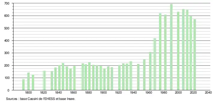 L'évolution du nombre d'habitants est connue à travers les recensements de la population effectués dans la commune depuis 1793. Pour les communes de moins de 10 000 habitants, une enquête de recensement portant sur toute la population est réalisée tous les cinq ans, les populations légales des années intermédiaires étant quant à elles estimées par interpolation ou extrapolation[21]. Pour la commune, le premier recensement exhaustif entrant dans le cadre du nouveau dispositif a été réalisé en 2006[22].