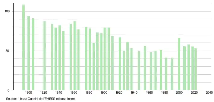L'évolution du nombre d'habitants est connue à travers les recensements de la population effectués dans la commune depuis 1793. Pour les communes de moins de 10 000 habitants, une enquête de recensement portant sur toute la population est réalisée tous les cinq ans, les populations légales des années intermédiaires étant quant à elles estimées par interpolation ou extrapolation[16]. Pour la commune, le premier recensement exhaustif entrant dans le cadre du nouveau dispositif a été réalisé en 2007[17].