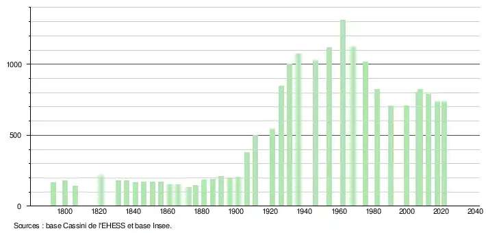 L'évolution du nombre d'habitants est connue à travers les recensements de la population effectués dans la commune depuis 1793. Pour les communes de moins de 10 000 habitants, une enquête de recensement portant sur toute la population est réalisée tous les cinq ans, les populations légales des années intermédiaires étant quant à elles estimées par interpolation ou extrapolation[19]. Pour la commune, le premier recensement exhaustif entrant dans le cadre du nouveau dispositif a été réalisé en 2007[20].