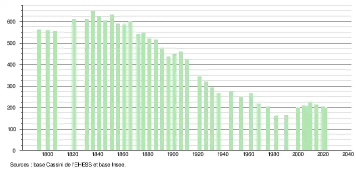 L'évolution du nombre d'habitants est connue à travers les recensements de la population effectués dans la commune depuis 1793. Pour les communes de moins de 10 000 habitants, une enquête de recensement portant sur toute la population est réalisée tous les cinq ans, les populations légales des années intermédiaires étant quant à elles estimées par interpolation ou extrapolation[14]. Pour la commune, le premier recensement exhaustif entrant dans le cadre du nouveau dispositif a été réalisé en 2004[15].