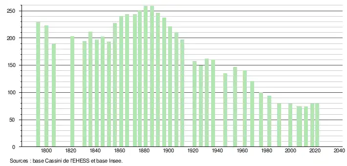 L'évolution du nombre d'habitants est connue à travers les recensements de la population effectués dans la commune depuis 1793. Pour les communes de moins de 10 000 habitants, une enquête de recensement portant sur toute la population est réalisée tous les cinq ans, les populations légales des années intermédiaires étant quant à elles estimées par interpolation ou extrapolation[16]. Pour la commune, le premier recensement exhaustif entrant dans le cadre du nouveau dispositif a été réalisé en 2007[17].