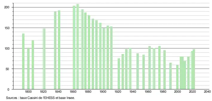 L'évolution du nombre d'habitants est connue à travers les recensements de la population effectués dans la commune depuis 1793. Pour les communes de moins de 10 000 habitants, une enquête de recensement portant sur toute la population est réalisée tous les cinq ans, les populations légales des années intermédiaires étant quant à elles estimées par interpolation ou extrapolation[17]. Pour la commune, le premier recensement exhaustif entrant dans le cadre du nouveau dispositif a été réalisé en 2004[18].