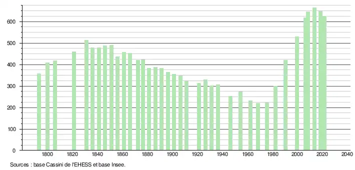 L'évolution du nombre d'habitants est connue à travers les recensements de la population effectués dans la commune depuis 1793. Pour les communes de moins de 10 000 habitants, une enquête de recensement portant sur toute la population est réalisée tous les cinq ans, les populations légales des années intermédiaires étant quant à elles estimées par interpolation ou extrapolation[19]. Pour la commune, le premier recensement exhaustif entrant dans le cadre du nouveau dispositif a été réalisé en 2008[20].
