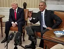 En 2005, Donald Trump se définit comme un « mix » de démocrate et de républicain[193]. En 2008, il contribue au financement de la campagne pour l'investiture démocrate de Hillary Clinton[194]. Durant la campagne présidentielle, il déclare que George W. Bush aurait dû être destitué en raison de la guerre en Irak mais, fervent partisan du Parti républicain, soutient John McCain, dont il assure qu'il « ferait un grand président »[195].